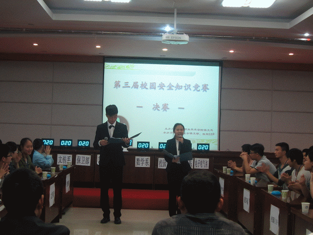 为进一步普及校园安全知识,增强师生安全意识,由学院安全办主办,学生会保卫部、校园“119”承办的第三届校园安全知识竞赛活动于5月11日19点30分在行政楼410成功举办。保卫处处长徐志军带领相关科室负责人到场指导,并担任竞赛仲裁评委,各教学系参赛小组,院、系保卫部,少数民族学生协会等参加了竞赛活动。